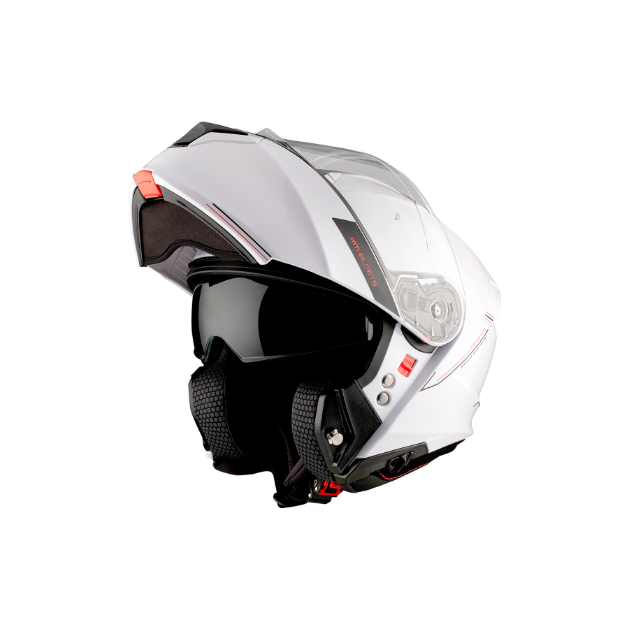 Casco Modular. Visera solar integrada retráctil. HOMOLOGACIÓN ECE/ONU 22-06. Cierre rápido micro ajustable. Bloqueo de mentón. Tres conchas interiores. Material interior extraíble y lavable, hipoalergénico y transpirable.